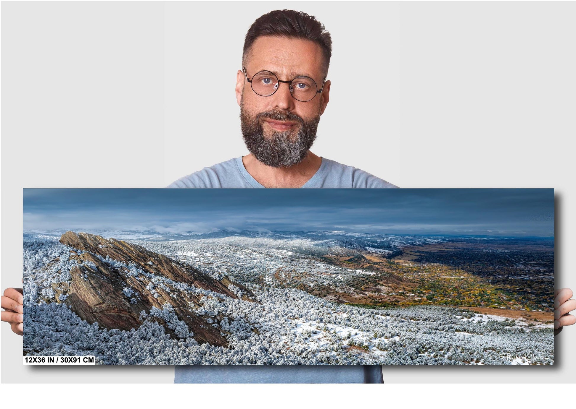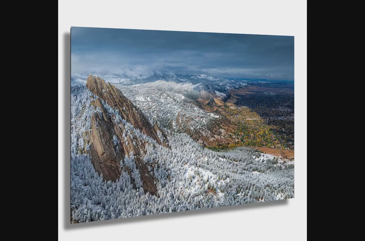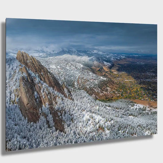 Bring the outdoors inside with this authentic piece that blends fall nature photography’s rich colors with the peaceful ambiance of snowy mountain photo scenes. Whether you prefer the textured warmth of canvas or the sleek modernity of metal or acrylic, this Boulder Flatirons wall art elevates your home decor while reflecting your love for nature.
