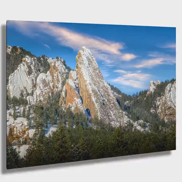 Enhance your home or office with this exquisite nature wall decor piece that perfectly blends artistic craftsmanship with the serene charm of snowy mountain photo landscapes. Whether you choose a ready to hang canvas, premium photo paper print, aluminum metal print, acrylic photo print, or triptych canvas panels, this Boulder Flatirons photo print will elevate your space with authentic Colorado mountain art.