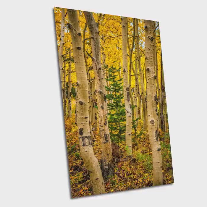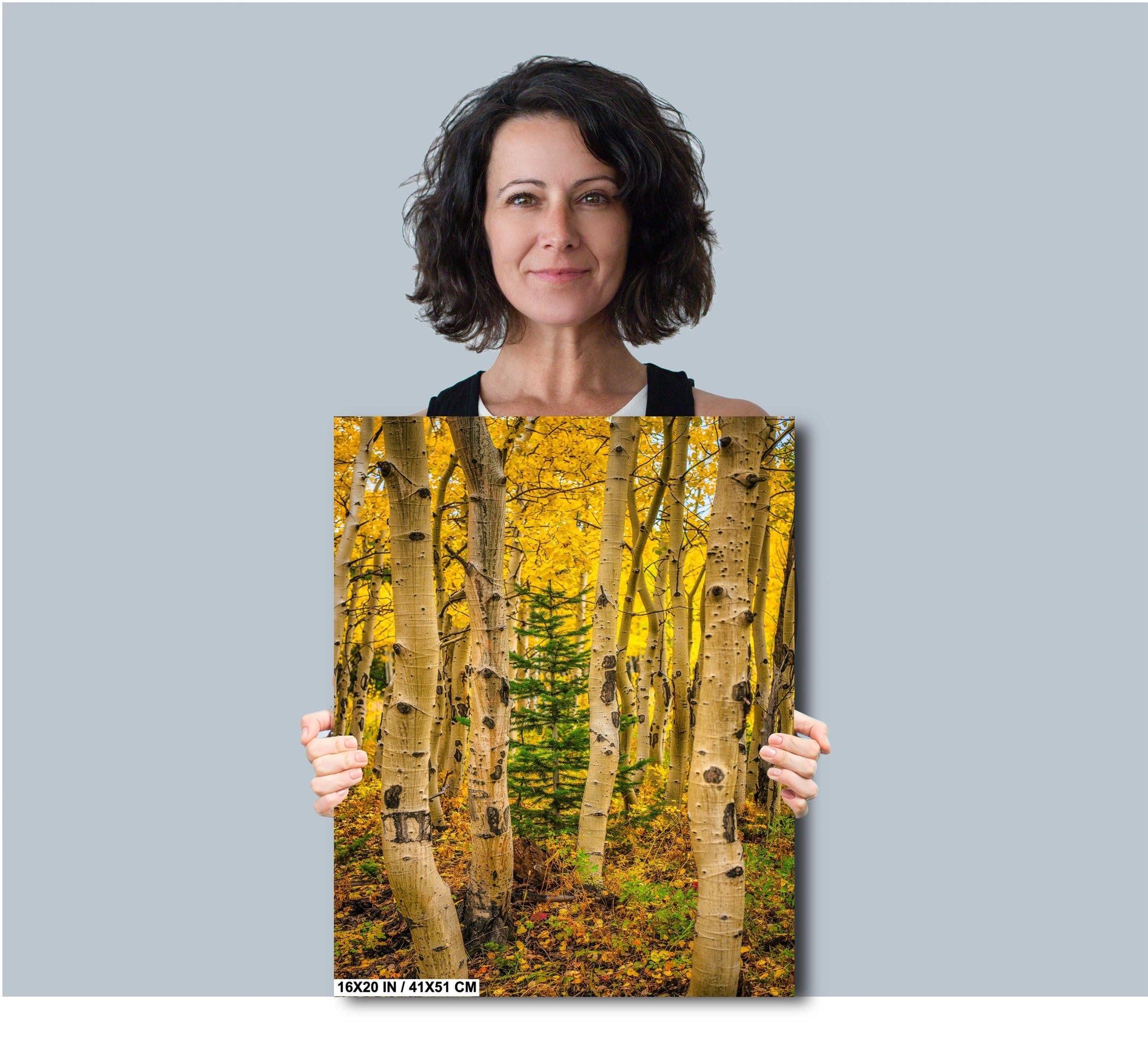 Production and shipping times range from 5 to 10 business days depending on the chosen format. Whether you prefer a classic framed photo print or a striking multi-panel canvas set, this Aspen forest photograph brings the tranquil beauty of autumn foliage into your living room or office.