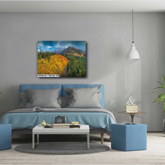 This fall landscape print is perfect for enhancing rustic cabin wall art collections or adding nature’s colorful fall scenery to your living room, office, or cabin retreat. The snow covered peaks art combined with the winding road wall art scene creates a dynamic composition that brings the essence of Colorado’s wilderness indoors. The rustic charm combined with modern printing technology offers an exceptional visual experience that lasts.