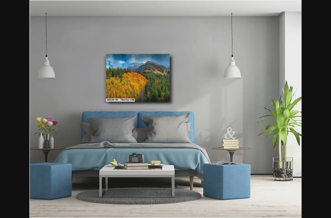Colorado photo wall art captures the stunning essence of the San Juan Mountains decor with vibrant autumn leaves and snow covered peaks art, bringing colorful fall scenery into your home. This autumn mountain canvas by 998 Millibar Photography offers crisp detail and rich tones, transforming any space with rustic home decor warmth while evoking adventure and tranquility. The mountain drone photo perspective highlights rugged terrain alongside a winding road wall art scene, creating an immersive outdoor experience indoors.