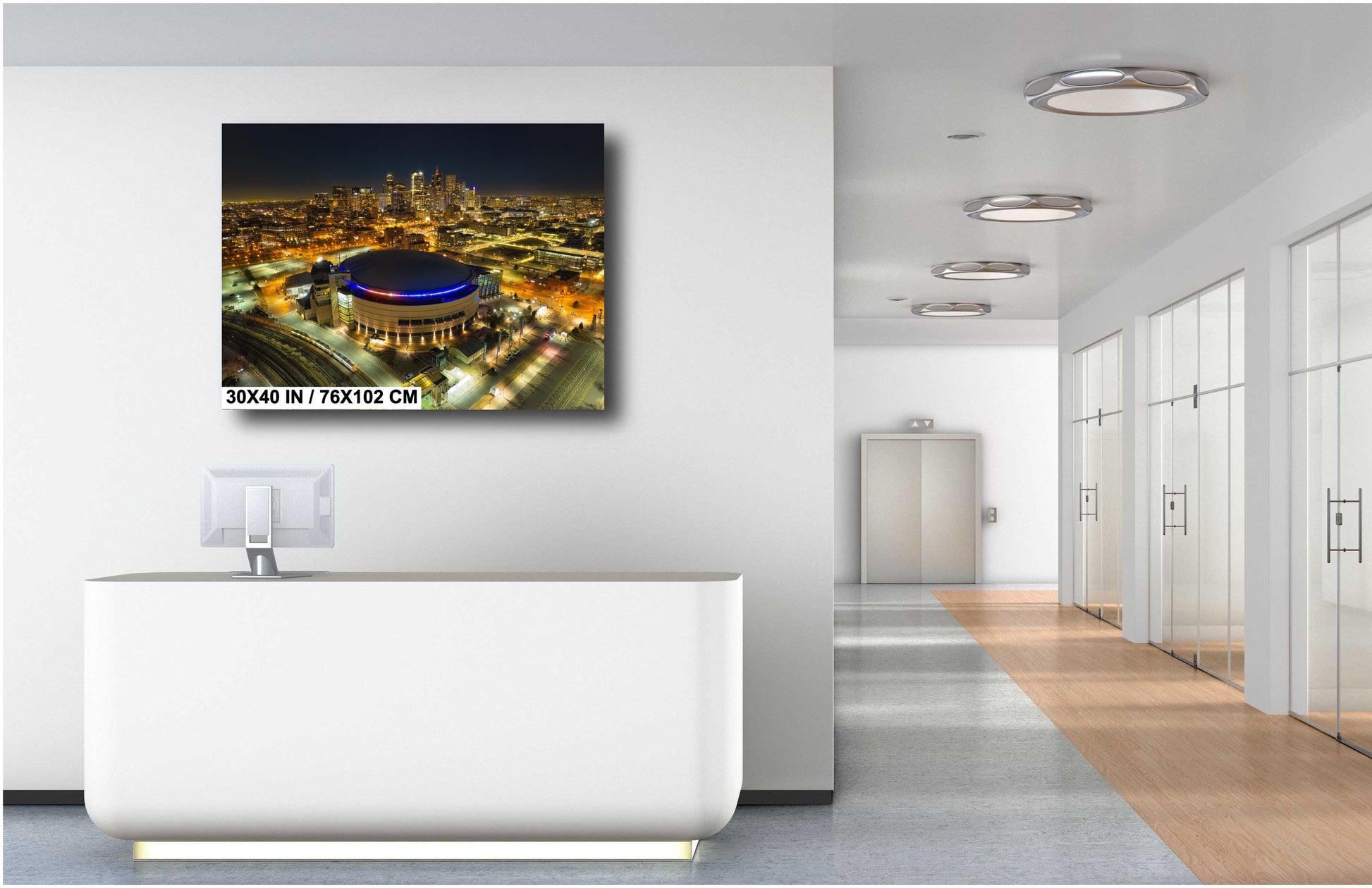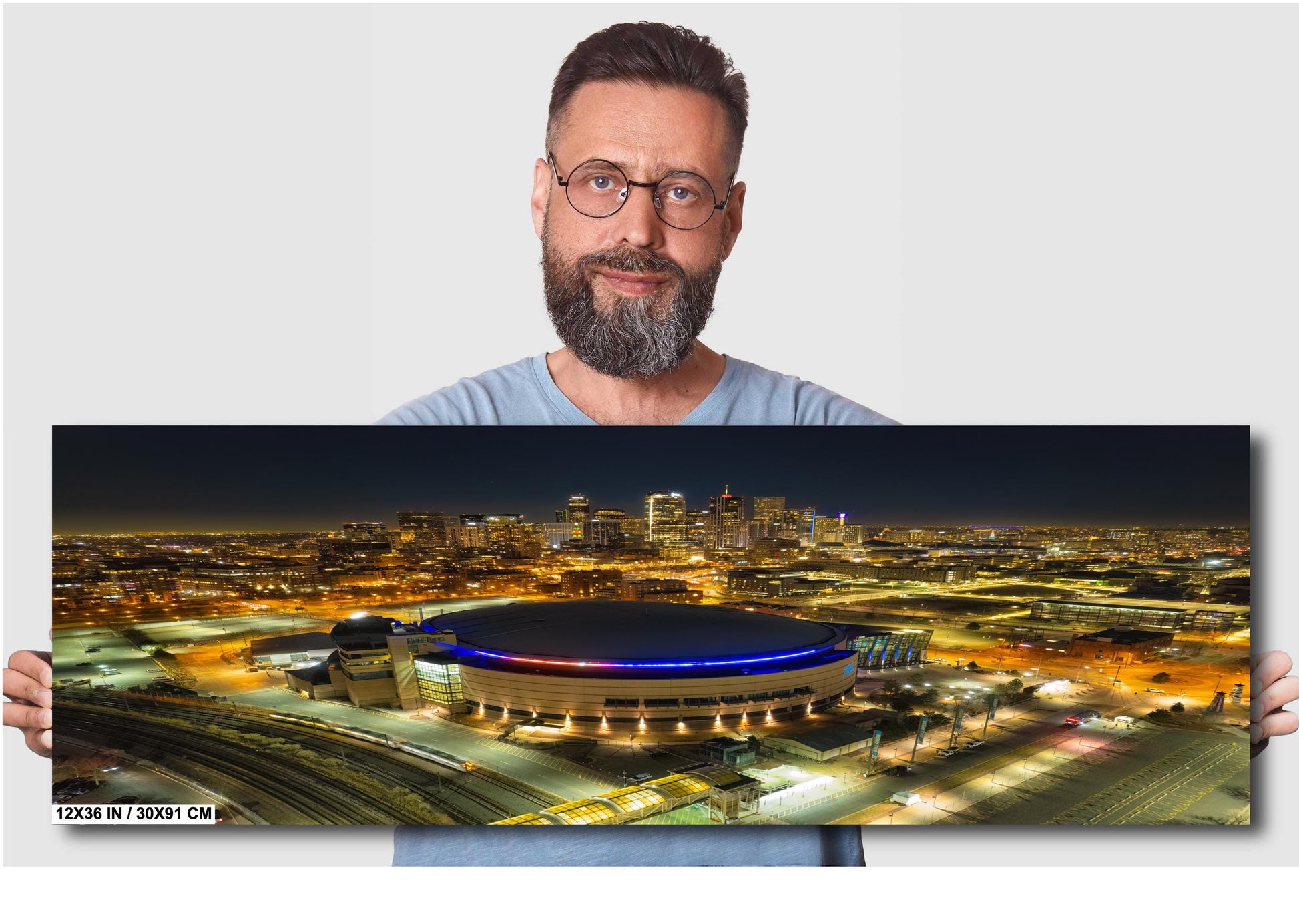 This Denver skyline photo captures the vibrant cityscape of Denver with the Ball Arena night print glowing brilliantly, delivering a stunning urban landscape photography experience that transforms any room. Featuring sharp details and vivid colors, this Denver skyline wall art highlights the energy and architectural beauty of the city, making it an ideal choice for fans seeking Colorado Avalanche decor or a Denver Nuggets poster alternative.