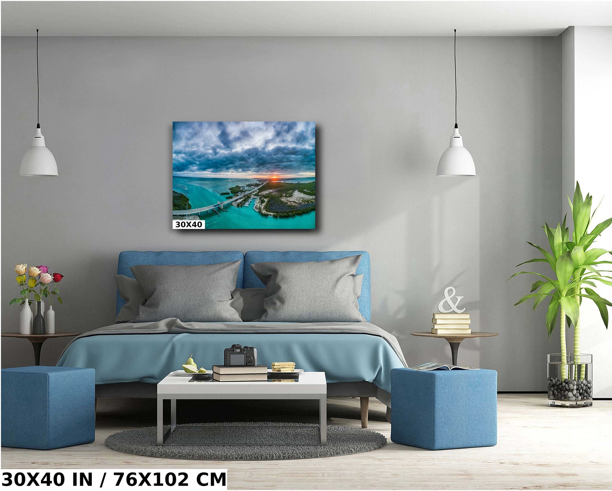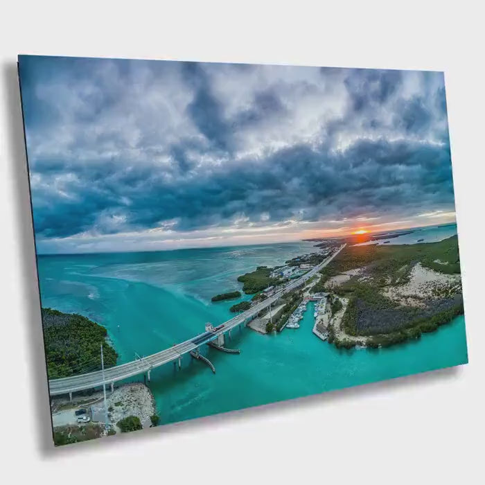 This Islamorada wall art captures the stunning sunset over the Snake Creek Bridge along US1, making it a perfect centerpiece for anyone seeking authentic Florida Keys decor. This Florida Keys canvas print uses a drone sunset picture to deliver vivid colors and sharp detail, bringing the warmth and beauty of nautical wall art into your living space. The Islamorada canvas print highlights the iconic Overseas Highway, offering a scenic US1 photo that adds coastal charm and elegance to any room.