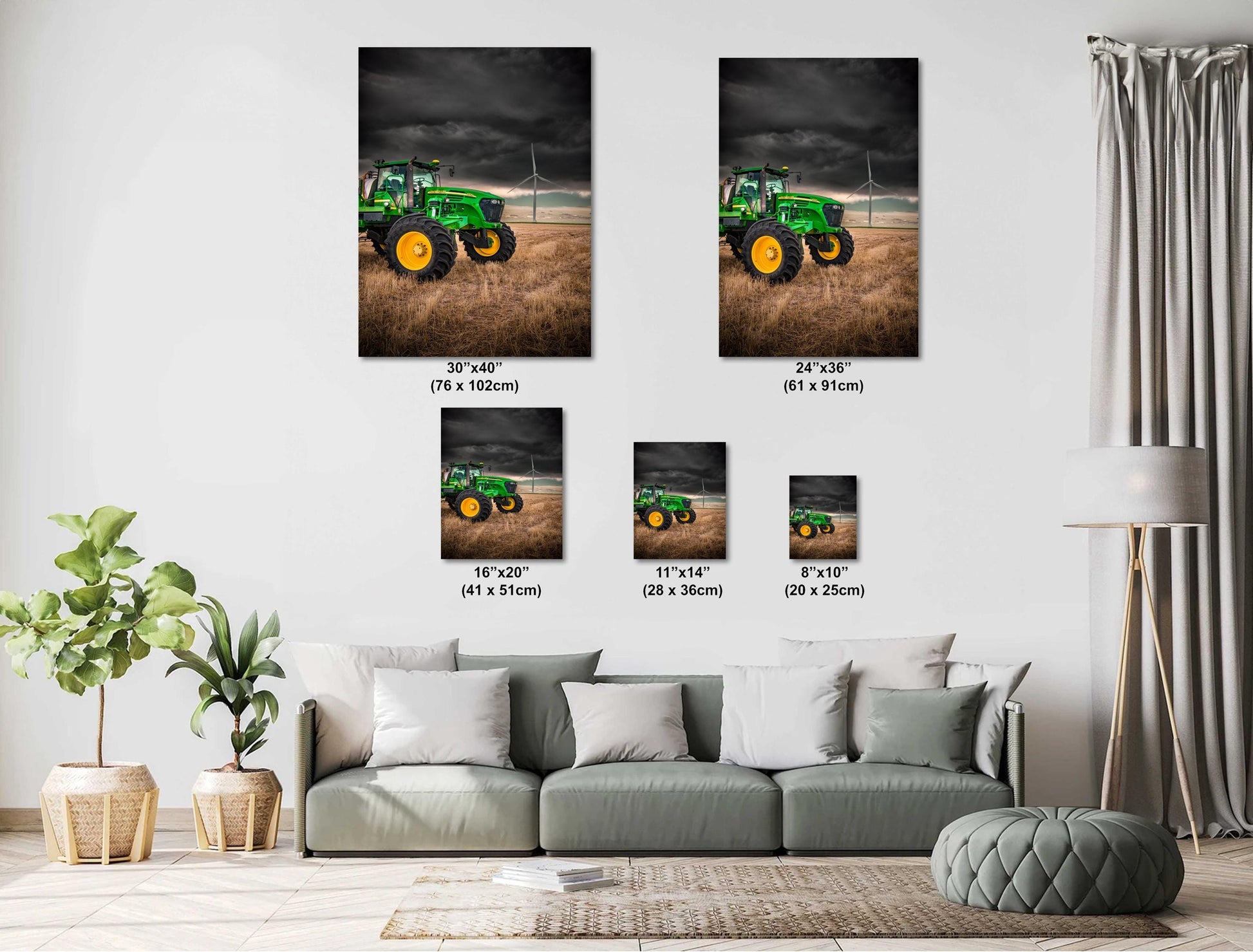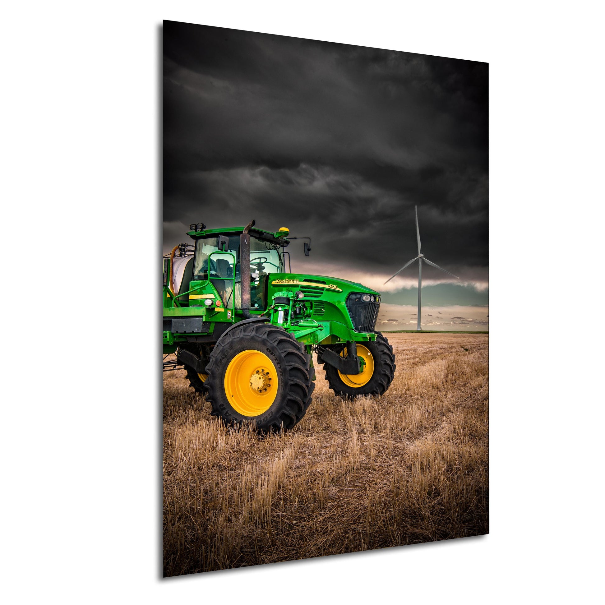 John Deere Tractor Wall Art vividly captures rural farm life with a dramatic farm landscape art print featuring a John Deere tractor beneath stormy skies alongside towering wind turbines. This rustic country decor piece offers a tractor photography print that transforms any room with authentic farmhouse art and meaningful renewable energy decor. Measuring up to 24x36 inches, this John Deere photography is printed on premium photo paper or available as ready-to-hang canvas, metal, or acrylic prints, delivering vibrant colors and lasting quality for fans of country living print and rural farm wall decor.