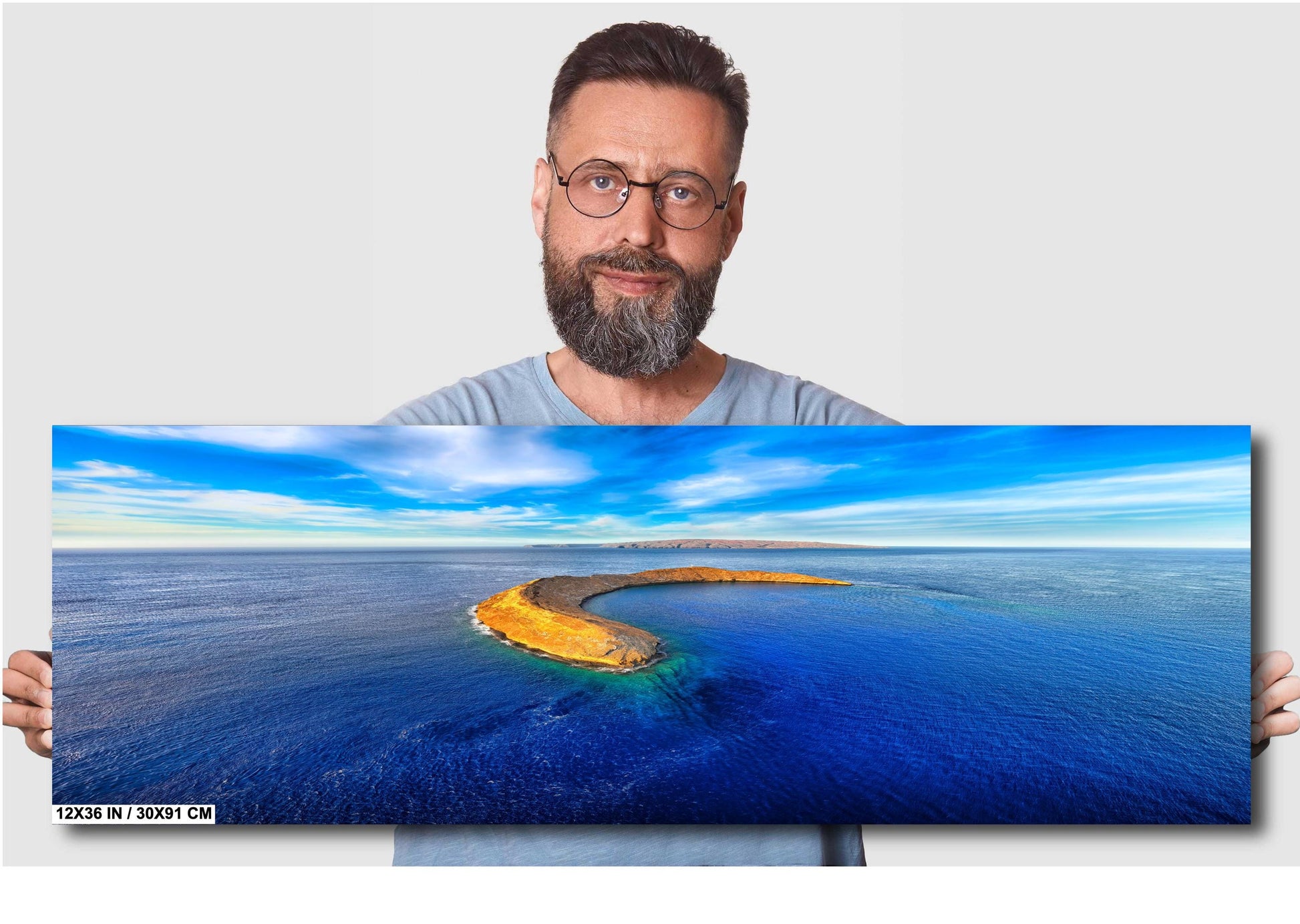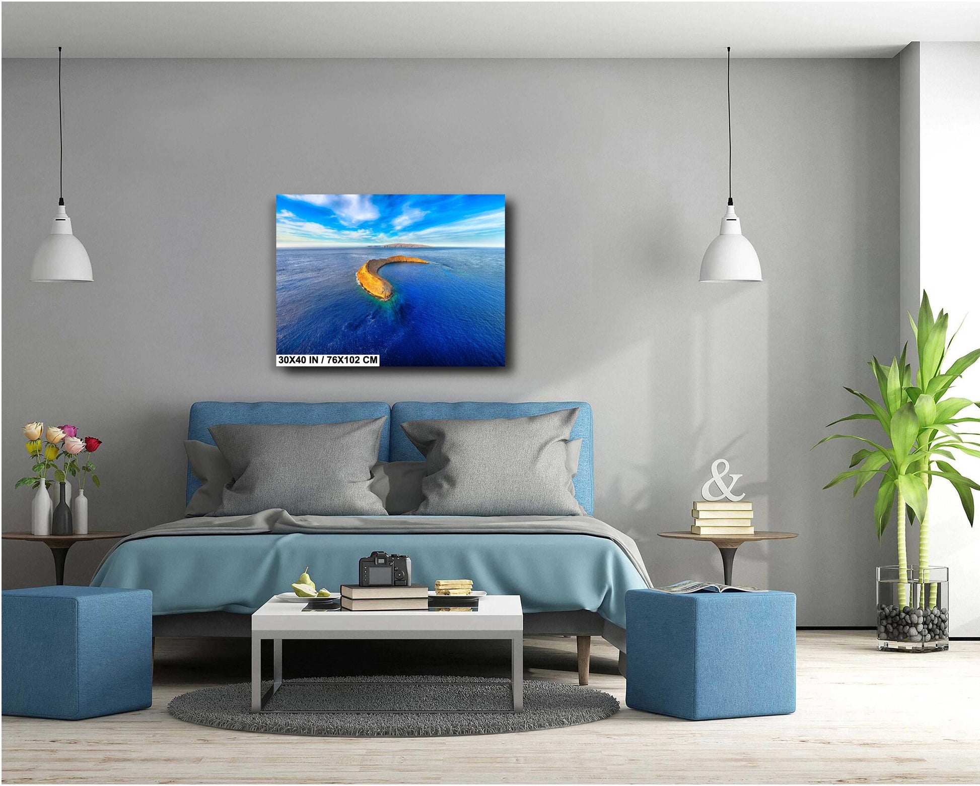 This tropical ocean print enhances modern coastal decor by adding a serene island atmosphere to any living room, office, or beach house. As a meaningful Hawaii travel gift, it captures the magic of Maui's iconic Molokini Crater and invites relaxation and admiration.