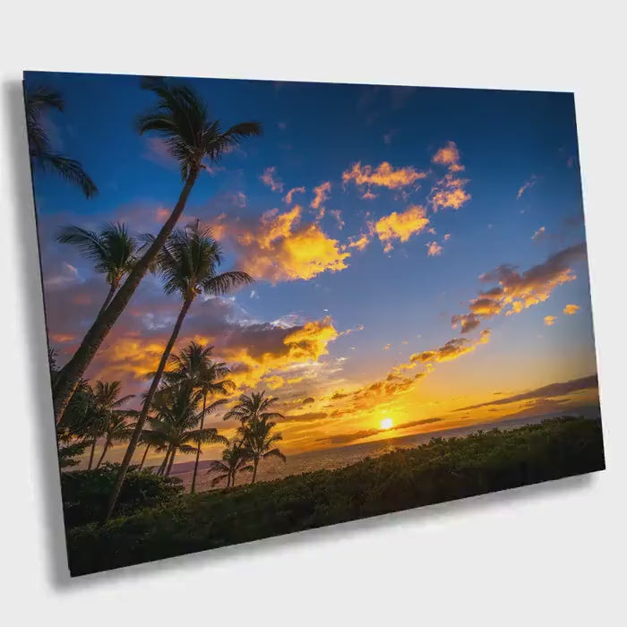 This tropical wall art is available in multiple formats designed to highlight the vibrant island sunset with precision and durability: