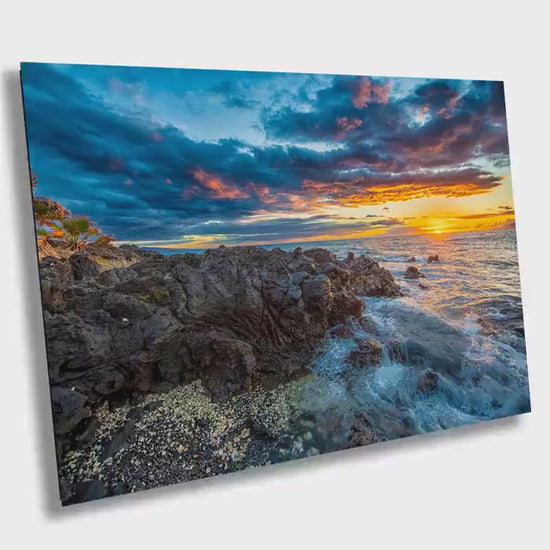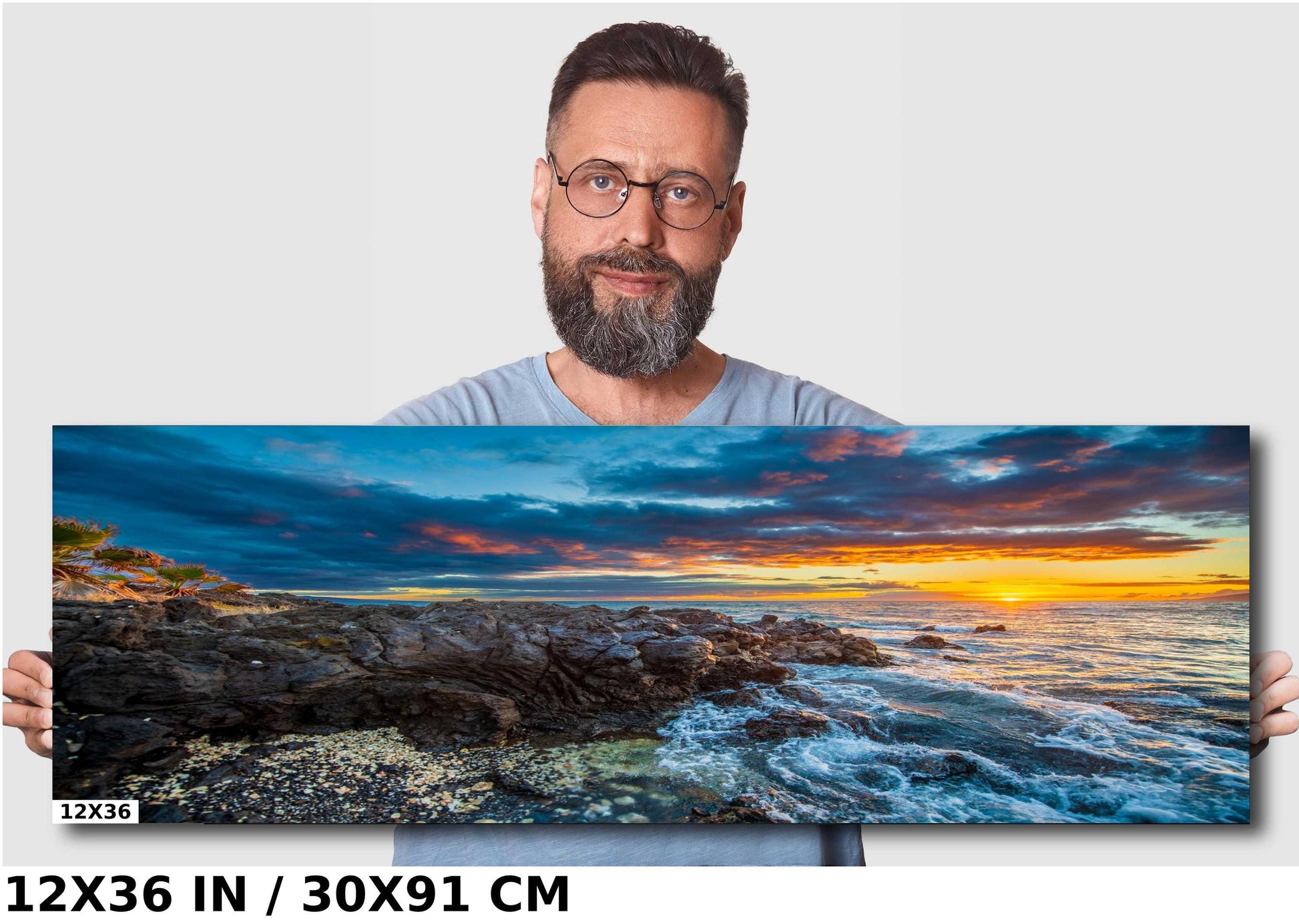 Bring the magic of Hawaii's tropical sunsets into your living room or office with this vibrant tropical sunset artwork. Whether you prefer panoramic wall art on canvas or a sleek metal photo print, this island sunset decor creates an inviting atmosphere that lasts. Custom sizes are available upon request—contact us to discuss your specific needs.