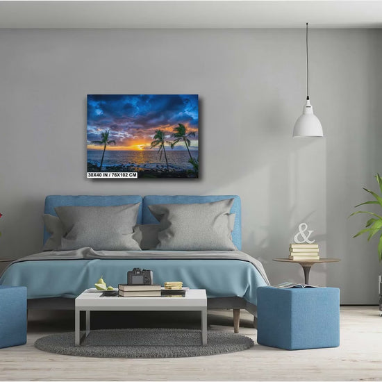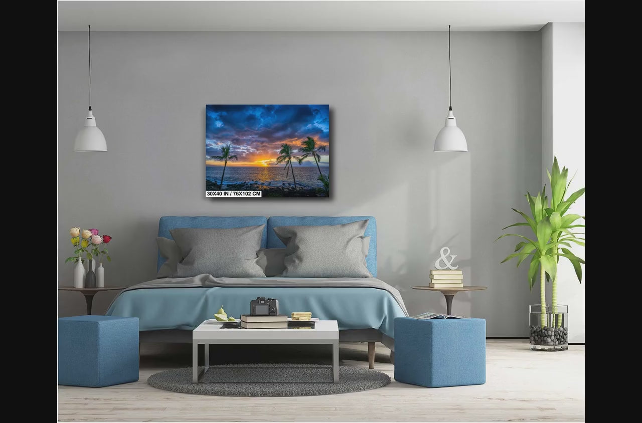 The Maui sunset photo print captures the breathtaking beauty of Hawaii’s ocean sunset decor, delivering vibrant tropical palm canvas art that brings calm and wonder into any living space. This vivid color print features palm tree wall art silhouettes against a rich, colorful dusk sky, providing an authentic piece of Hawaii wall art designed to transform your home or office atmosphere. Crafted by 998 Millibar Photography, each Maui sunset photo print uses UV resistant prints that guarantee long-lasting brilliance and quality you can trust.