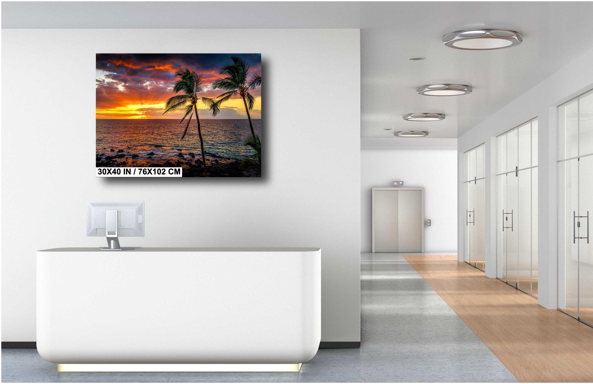Each Maui Sunset Photo Print undergoes rigorous quality checks ensuring exceptional image clarity and vibrant color reproduction. The UV resistant metal print option guarantees your artwork retains its brilliance even in bright light environments, perfect for both indoor and outdoor coastal home decoration. This tropical wall art features palm tree wall art details that highlight the lush environment of Hawaii’s palm-fringed beaches.