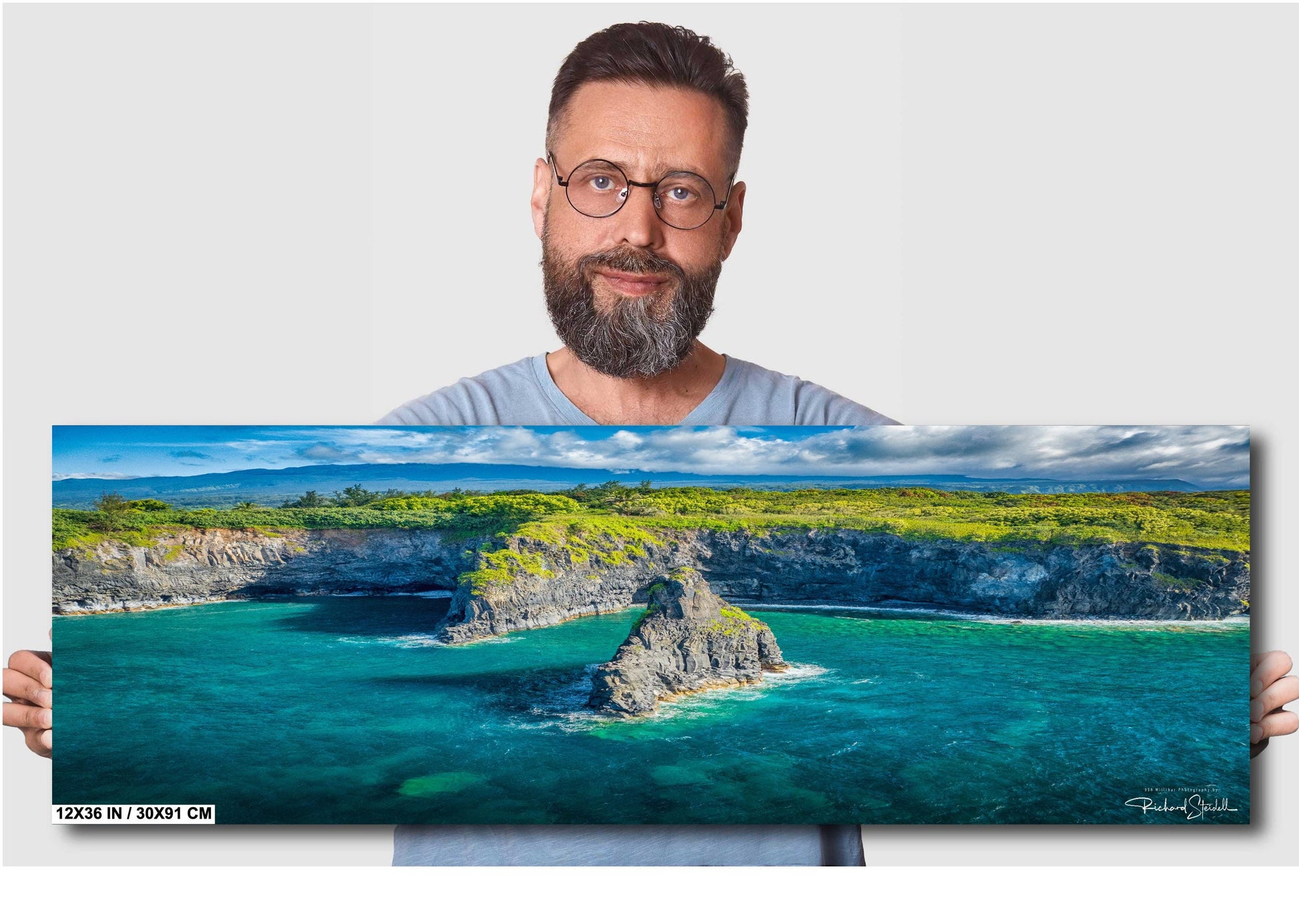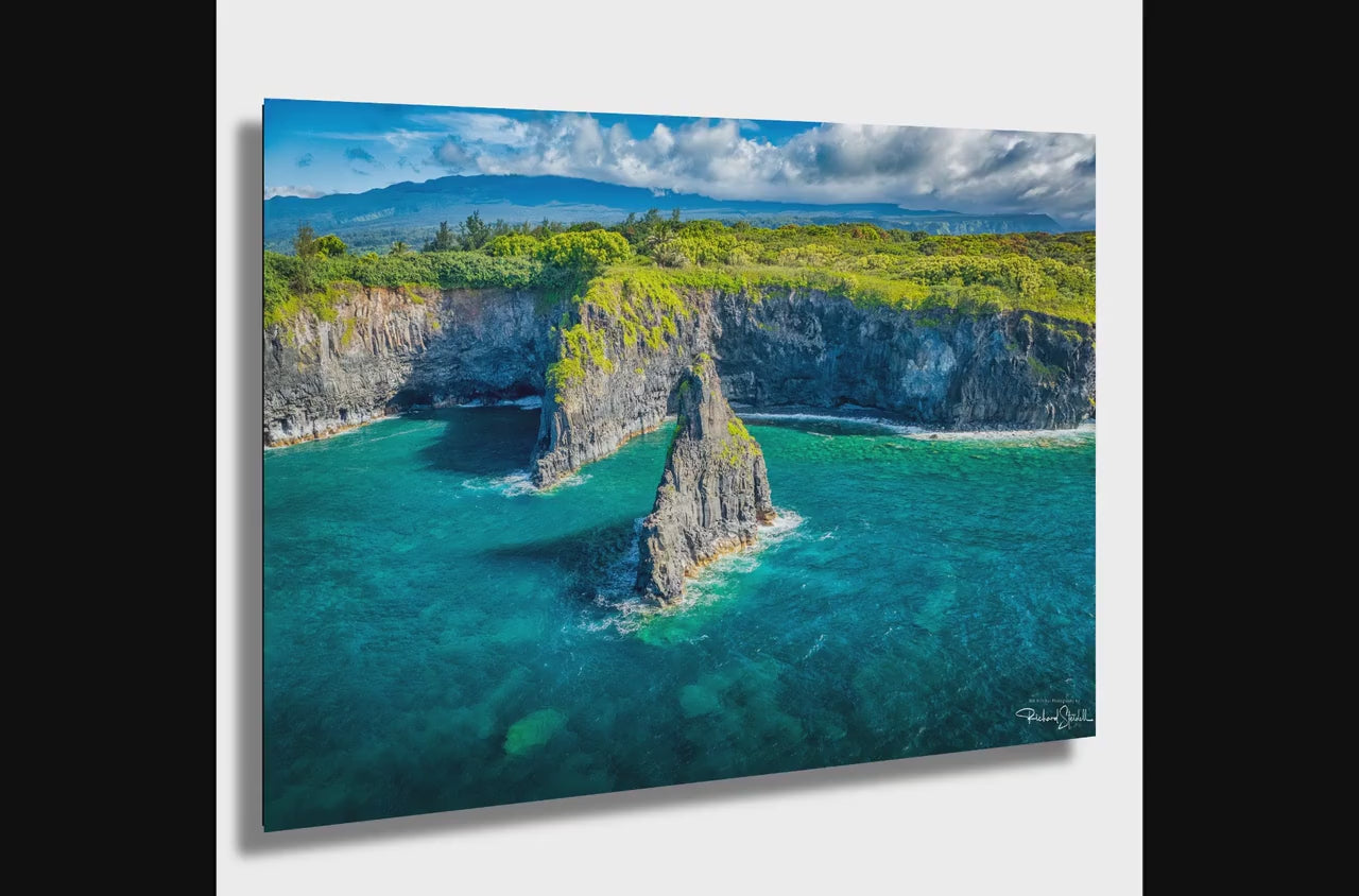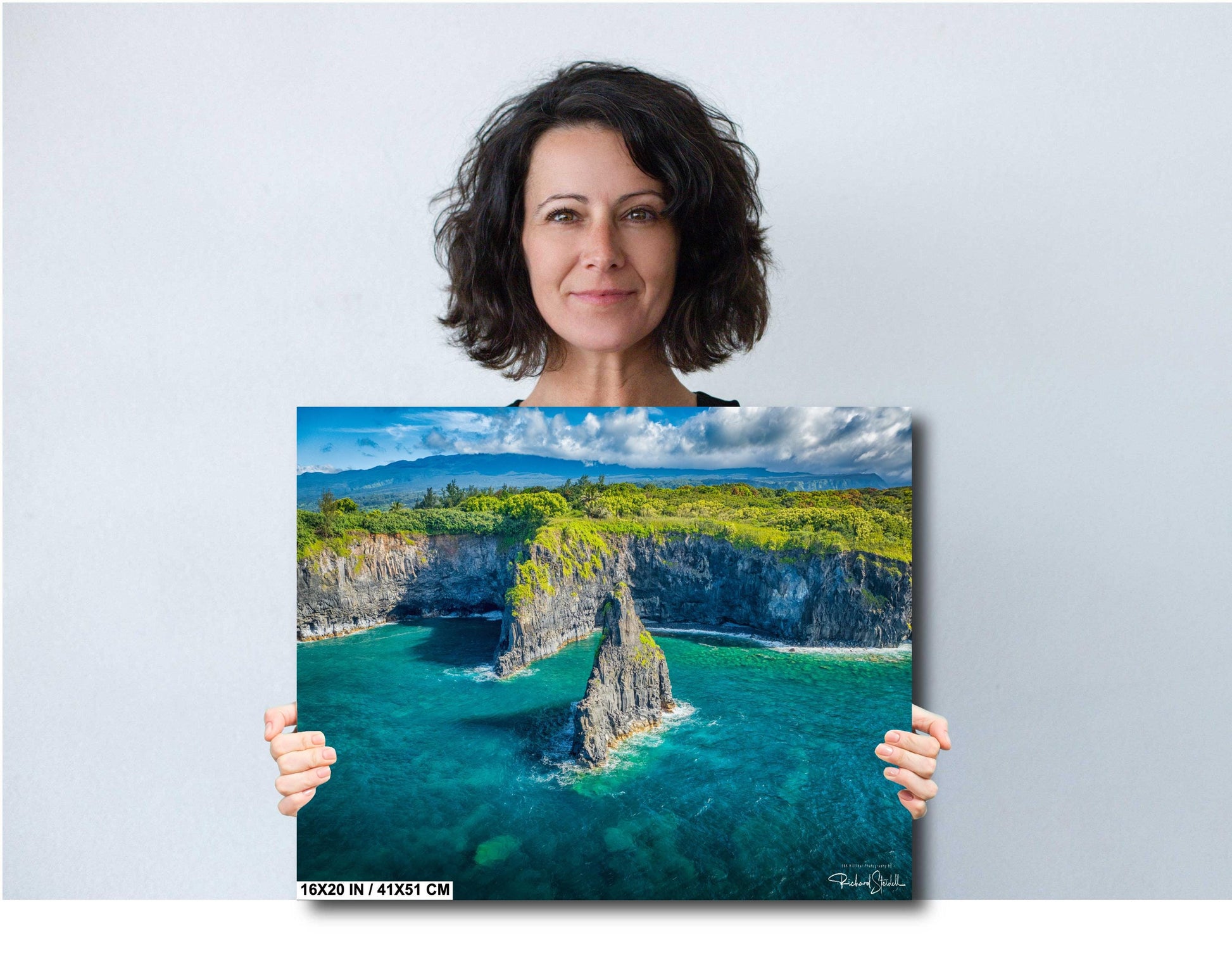 Bring coastal home decor into your living room, bedroom, or office with this tropical beach print inspired by the Road to Hana coastline. Whether you prefer acrylic photo prints that illuminate your space or aluminum metal prints that add a polished edge, this Hawaii landscape art collection delivers calming wall decor fused with island charm. Custom sizes are available upon request—send a message to tailor your Maui wall art precisely to your space.