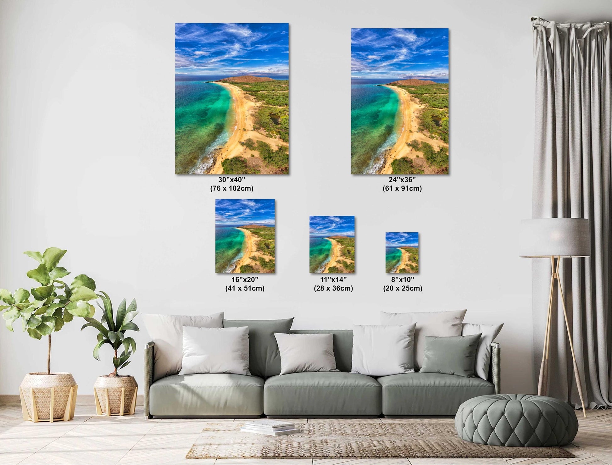 - Premium Photo Paper: Printed on professional-grade paper in sizes 8x10, 11x14, 16x20, or 24x36 inches. This option delivers sharp, vivid colors that preserve your Makena Beach print for years when framed.