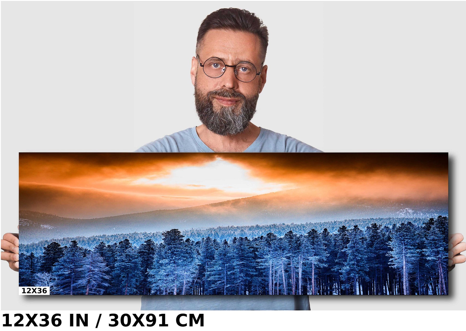 This scenic wall art piece enhances any room with its pine tree photo print that evokes the crisp air and tranquil atmosphere of a snowy mountain morning. Perfect as an outdoor lovers gift or as scenic nature poster decor in living rooms, offices, or cabin retreats, it adds warmth and inspiration. The winter sunrise print captures vivid natural hues that brighten your space while providing a calming effect.