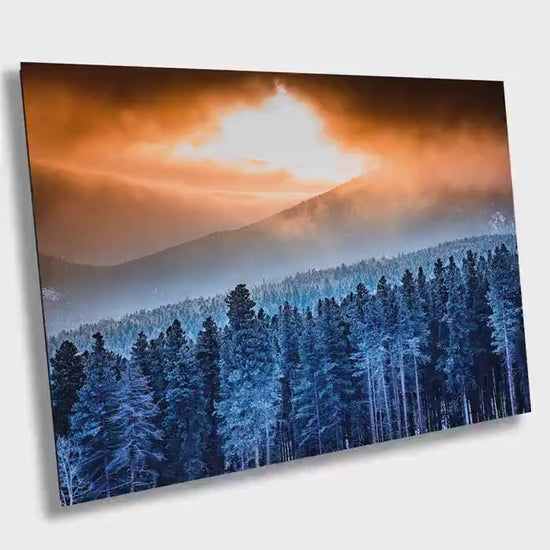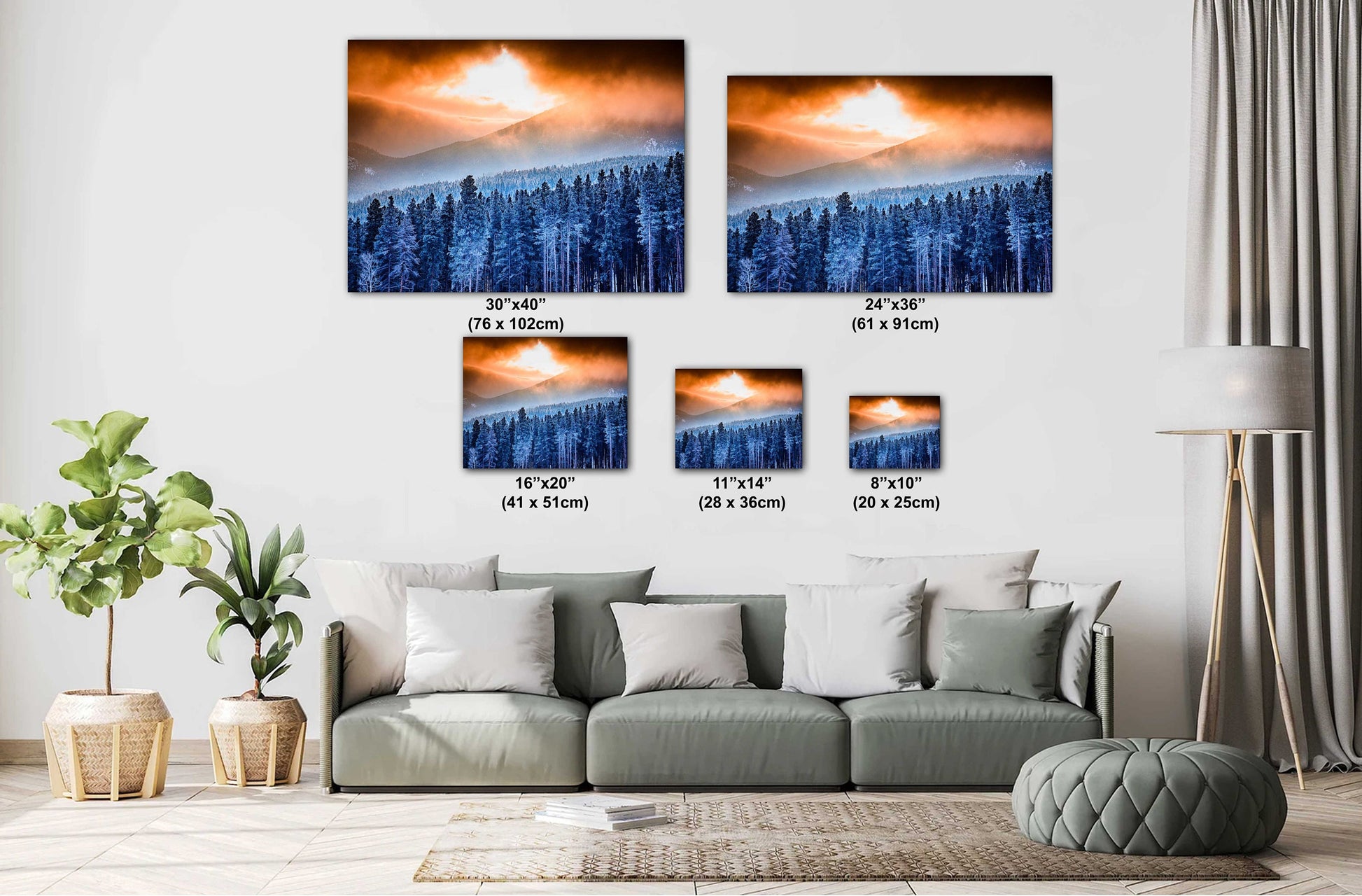Mountain Sunrise Wall Art captures the breathtaking beauty of a winter sunrise over snow-covered pine trees, offering stunning nature landscape decor that transforms any space into a serene retreat. This ready to hang canvas delivers a peaceful mountain view poster experience, perfect for outdoor lovers seeking authentic snowy mountain art that brings nature indoors. Crafted by 998 Millibar Photography, this Mountain Sunrise Wall Art features vibrant colors and sharp details across multiple formats, ensuring each piece preserves the magic of the winter sunrise print. Tested for quality, every print undergoes meticulous inspection to guarantee vivid colors and lifelike textures.