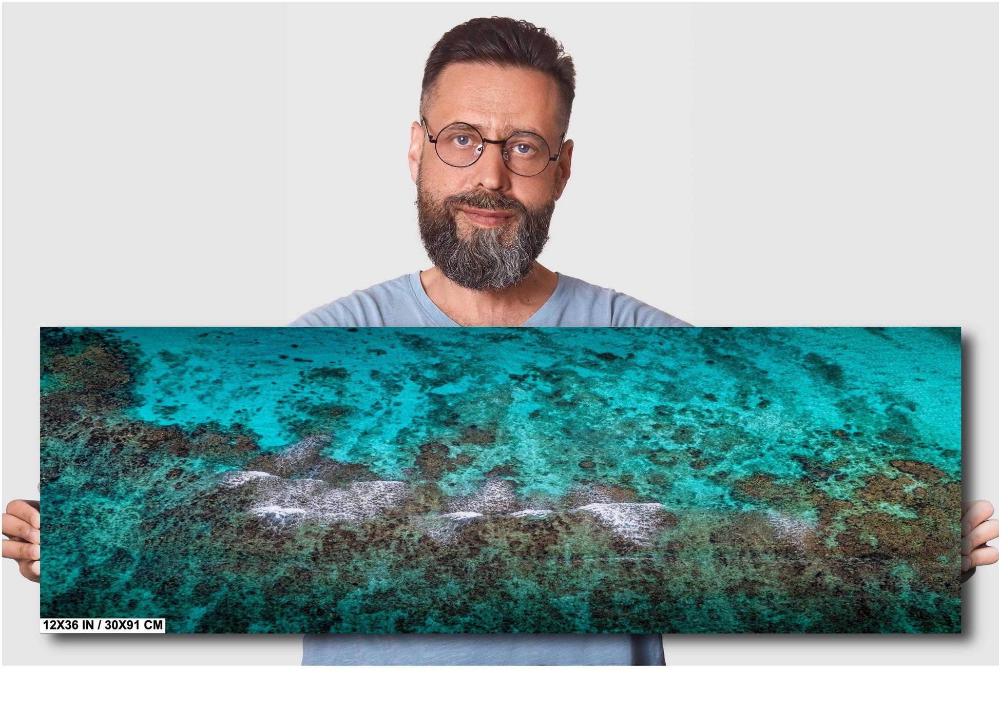 This ocean photography print captures a stunning aerial wave photo over a vibrant reef image, making it the ideal coastal landscape art to bring tropical sea artwork into your home or office. Designed by 998 Millibar Photography, this framed ocean print offers sharp details and vivid colors that create a calming and inspiring atmosphere. Crafted with UV resistant prints, each piece guarantees long-lasting beauty and color retention, backed by our reputation for quality and attention to detail.