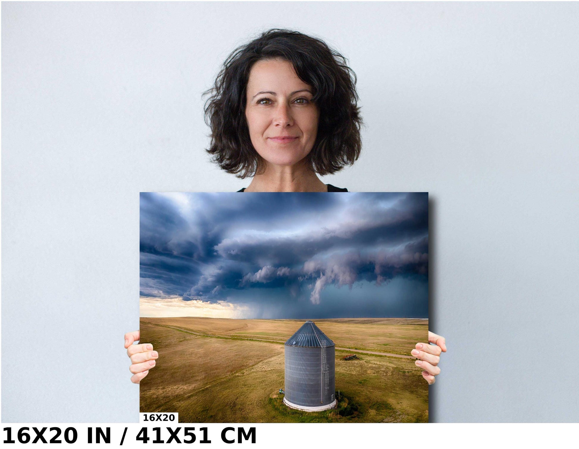 The storm over farm print captures the raw power of nature through dramatic landscape art, delivering a moody sky photography experience that transforms any room. This farm scene wall art features a dark storm photo print over the eastern plains of Colorado, perfect for adding rustic farmhouse decor to your home or office with intense visual drama. Available in multiple formats, including ready to hang canvas, aluminum metal prints, acrylic photo prints, and split panel canvas, this nature photography gift combines versatility with lasting beauty.