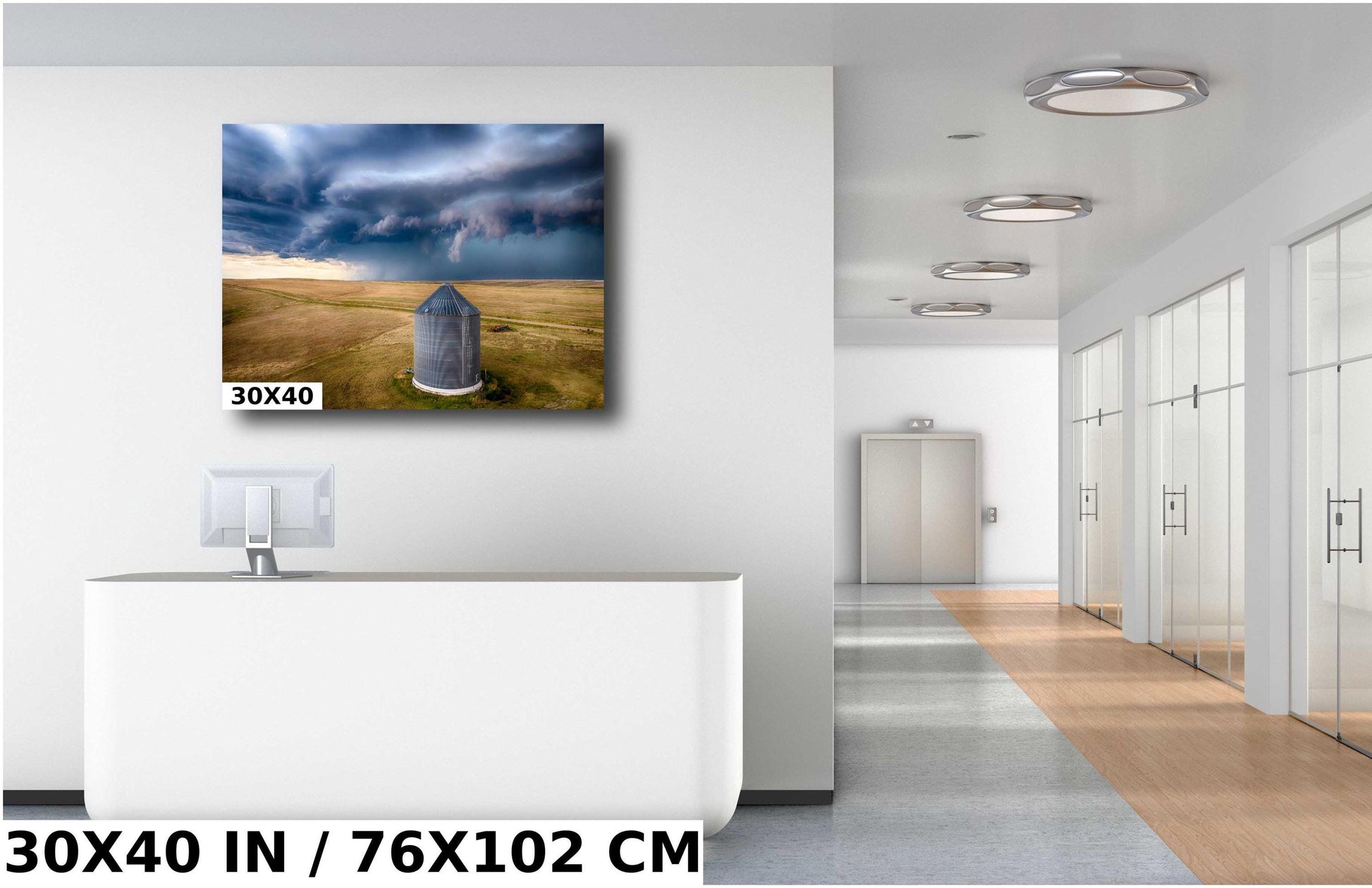 Invest in this farm scene wall art to enjoy the intensity of stormy weather photography combined with versatile presentation options. Bring the moody sky photography ambiance into your home or office today.