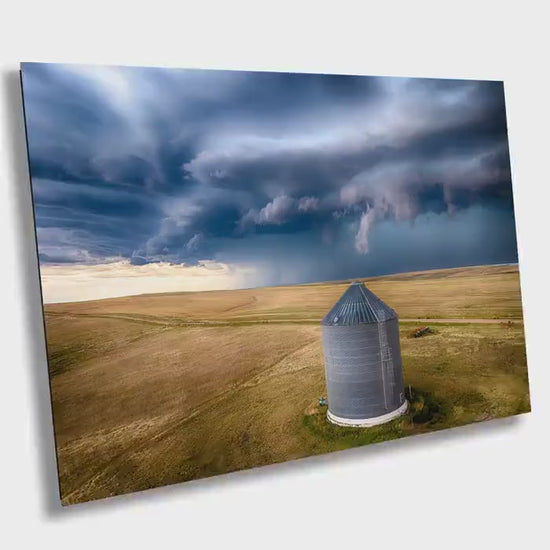 Each storm over farm print uses premium materials designed for durability and vibrant color. The ready to hang canvas comes with 0.75 or 1.5 inch thick wooden stretcher bars that provide a clean gallery-style finish without visible staples or lines. Aluminum metal prints are produced on sleek 3/64" thick panels coated with glossy UV resistant ink to maintain long-lasting vibrancy. Acrylic photo prints feature museum-quality 1/8" thick clear acrylic that enhances color depth and sharpness edge to edge. The split panel canvas divides the image into three panels, creating a modern look that makes a bold statement on larger walls.