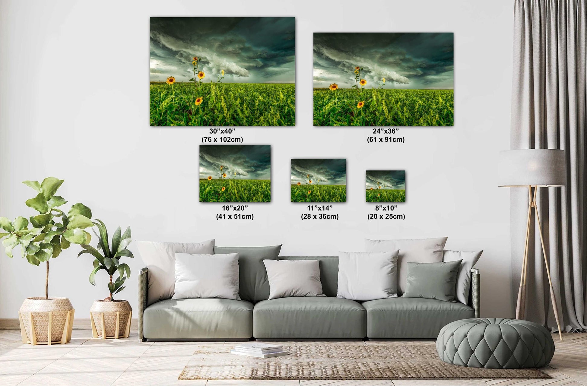 Each option uses weather photography art techniques to faithfully reproduce the intense contrasts of the colorful storm photo and sunflower wall decor. Except for vivid photo paper—which is designed for framing—all prints arrive ready to hang right out of the box. Production and shipping times typically range from 5 to 10 business days depending on your chosen format.
