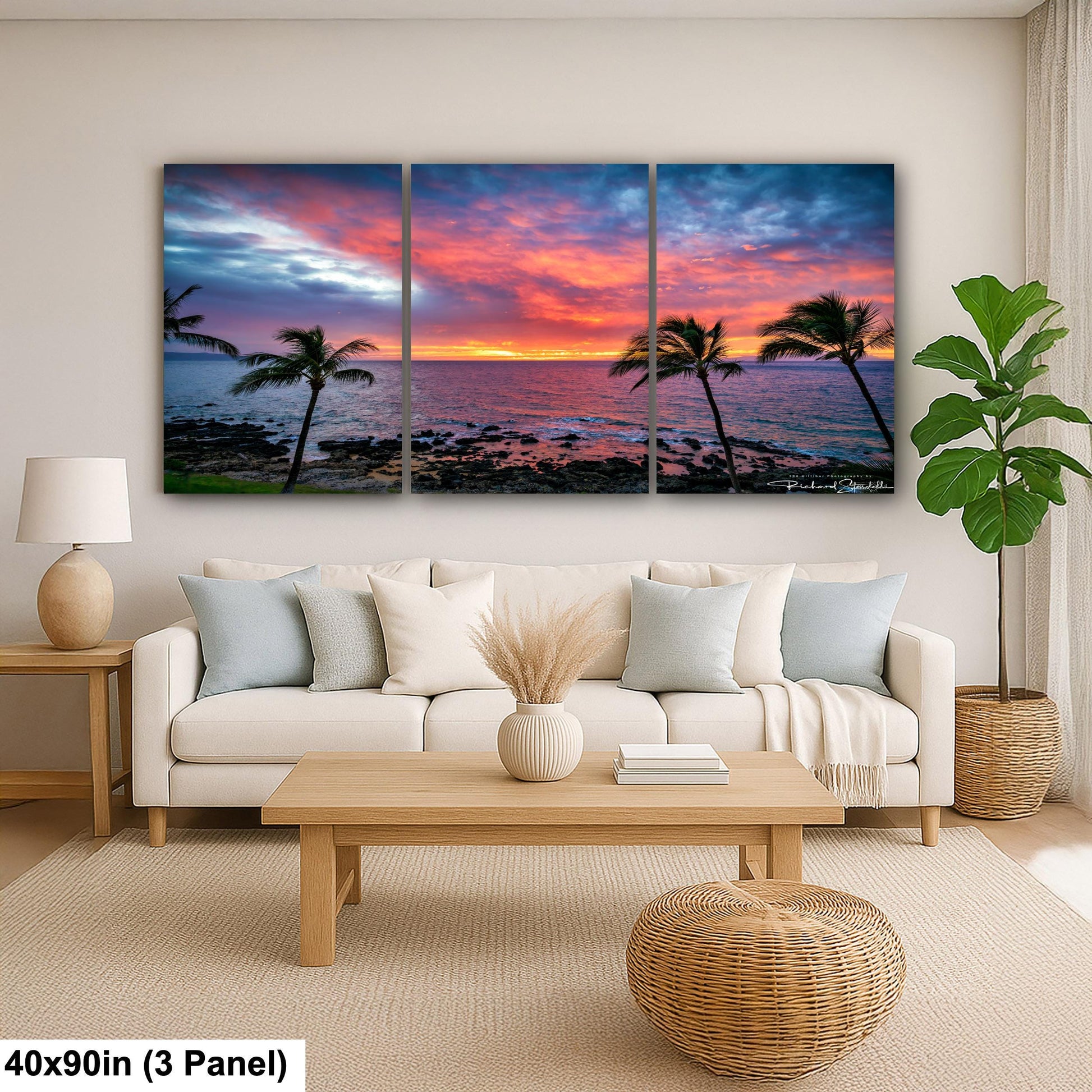 Sunset Wall Art captures the breathtaking Maui Beach View with Tropical Palm Trees swaying gently under a Fiery Orange Sky. This Hawaiian Beach Art transforms your space with an Ocean View Artwork that embodies the warm breeze and golden hour decor of a Lanai Tropical Scene. Crafted to bring serenity and beauty, this Sunset Canvas Print is perfect for adding a relaxing island vibe to any room.