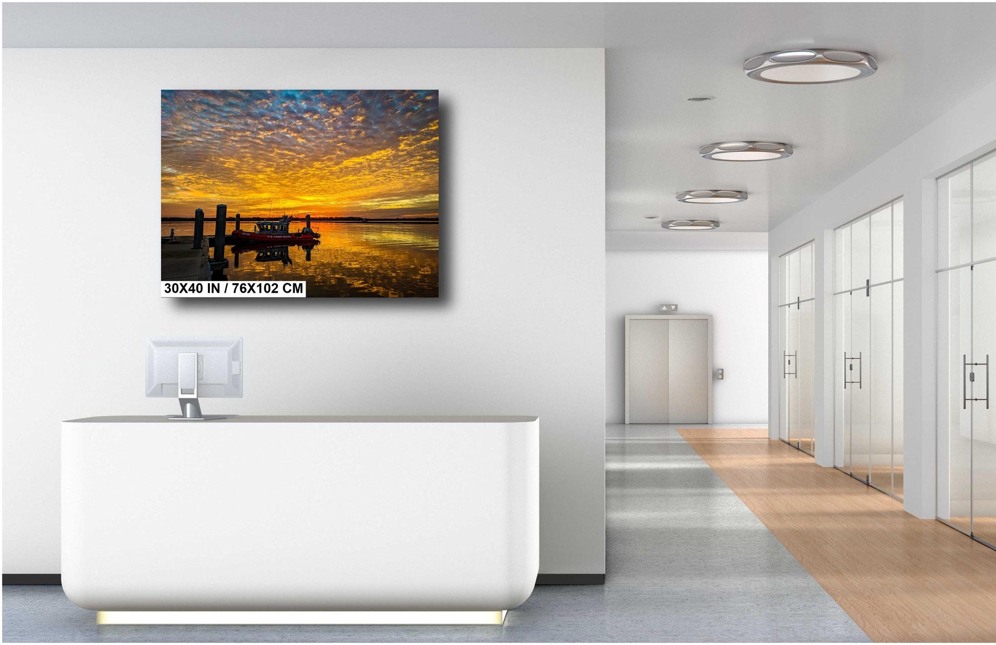 U.S. Coast Guard Wall Art captures the iconic RBS 25 boat at sunrise in South Carolina, delivering vivid boat sunrise imagery that honors marine rescue efforts and enhances any space with stunning nautical photo canvas detail. This USCG home decoration offers sharp, vibrant colors and precise printing technology that brings coastal service to life in your living room, office, or hallway.