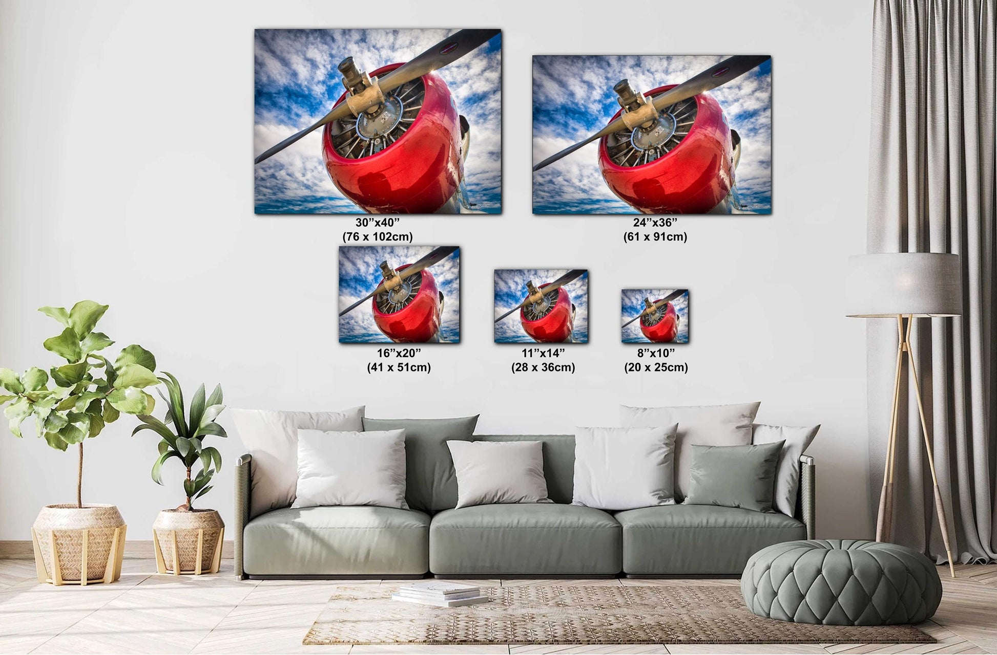 Each piece is produced with high quality photo paper or premium materials to ensure vivid colors and sharp details that last. Choose from multiple formats including a ready to hang canvas, aluminum metal print, acrylic plane decor, or even a unique three panel canvas for a modern wall decor effect. Our prints feature UV resistant inks that prevent fading, ensuring your propeller plane artwork remains vibrant for years.